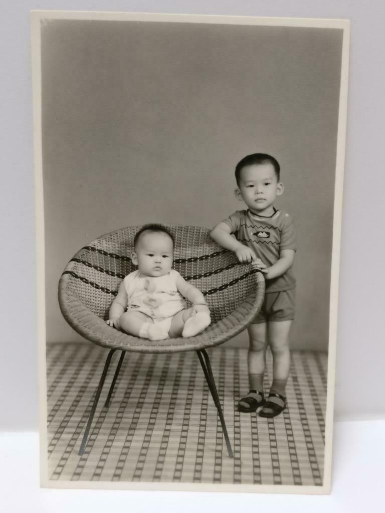 1950 Asian Chinese Siblings Cute Baby Retro Chair Studio Portrait B&W Photo P293