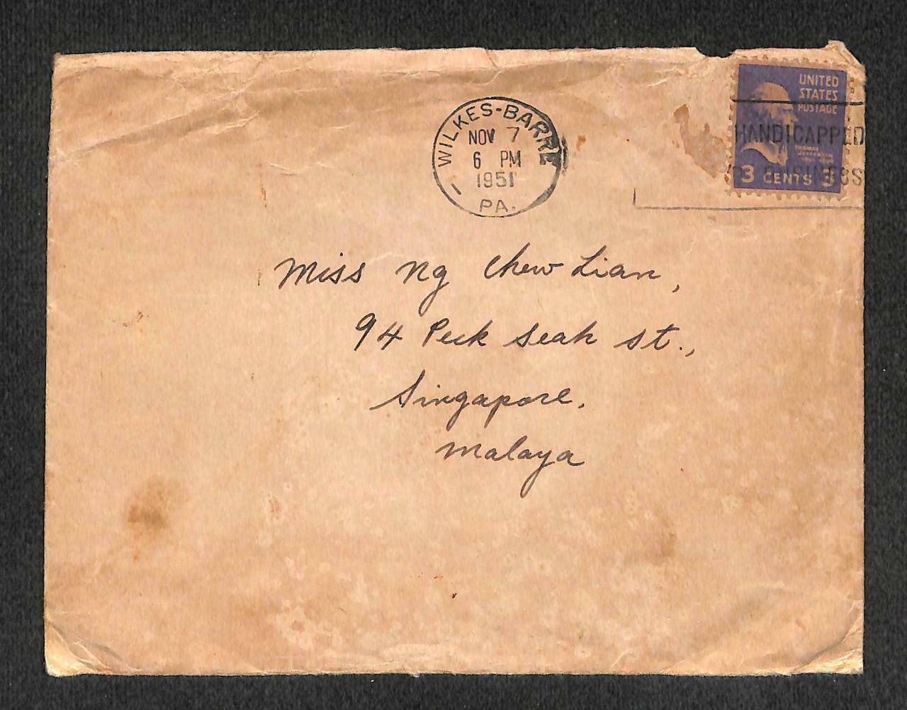 1951 USA To Singapore 3 Cents Handicapped Stamp Chop Airmail Cover (C1391)