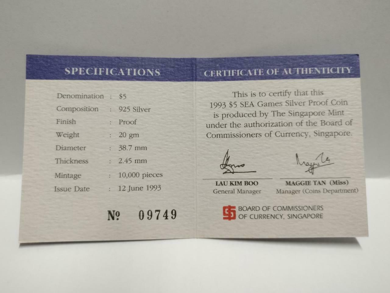 Singapore $5 Olympic SEA Games 1993 Proof Silver Coin With Box & Cert (C040b)