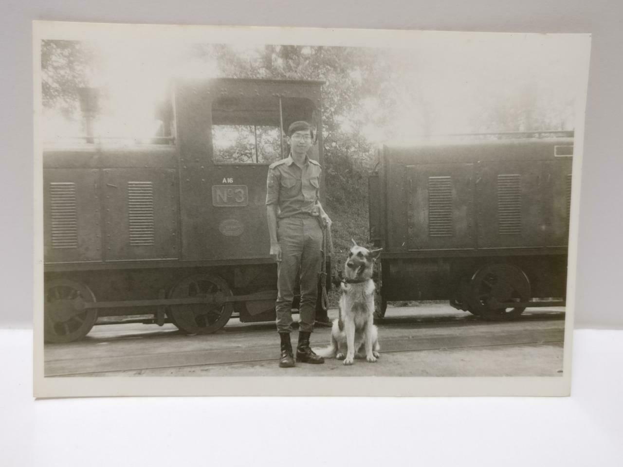 Vintage Asian Chinese Man In Army Uniform & Dog Vehicle Truck B&W Photo (P284)