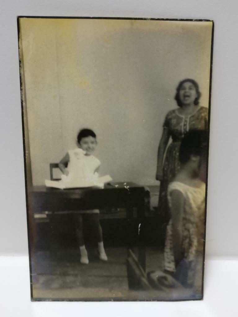 Vintage Asian Girl Birthday Party Cake Smiling Candid Portrait B&W Photo (P319)