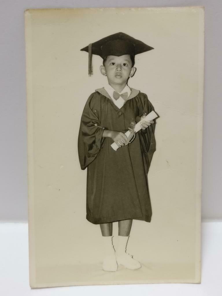 Vintage Asian Kid Boy In Graduation Gown With A Scroll Studio B&W Photo (P435)
